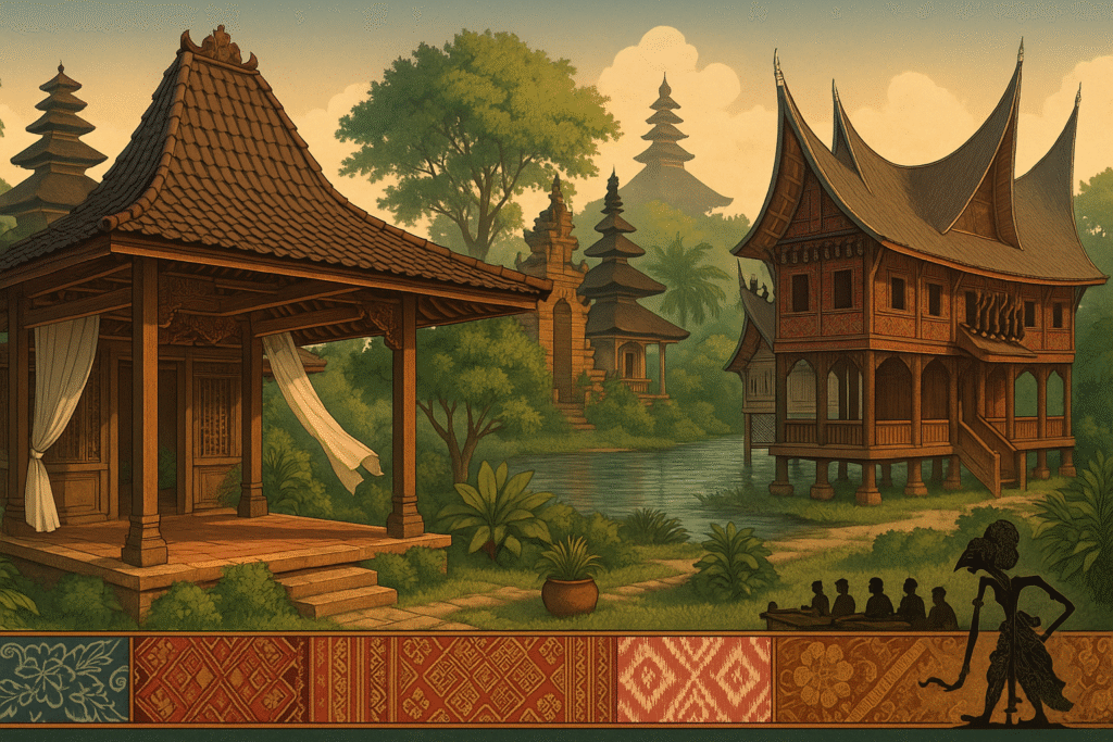 Seni pertunjukan merajut ajaran etika melalui estetika. Wayang menafsir epik ke dalam humor, satire, dan filosofi, diiringi gamelan yang membangun ruang bunyi kolektif. Tari-tarian—dari bedhaya hingga kecak—mengartikulasikan doa, kosmologi, atau narasi sejarah. Instrumen tradisional seperti angklung dan sasando mengajarkan keteraturan dalam kebersamaan: harmoni lahir dari koordinasi banyak tangan.